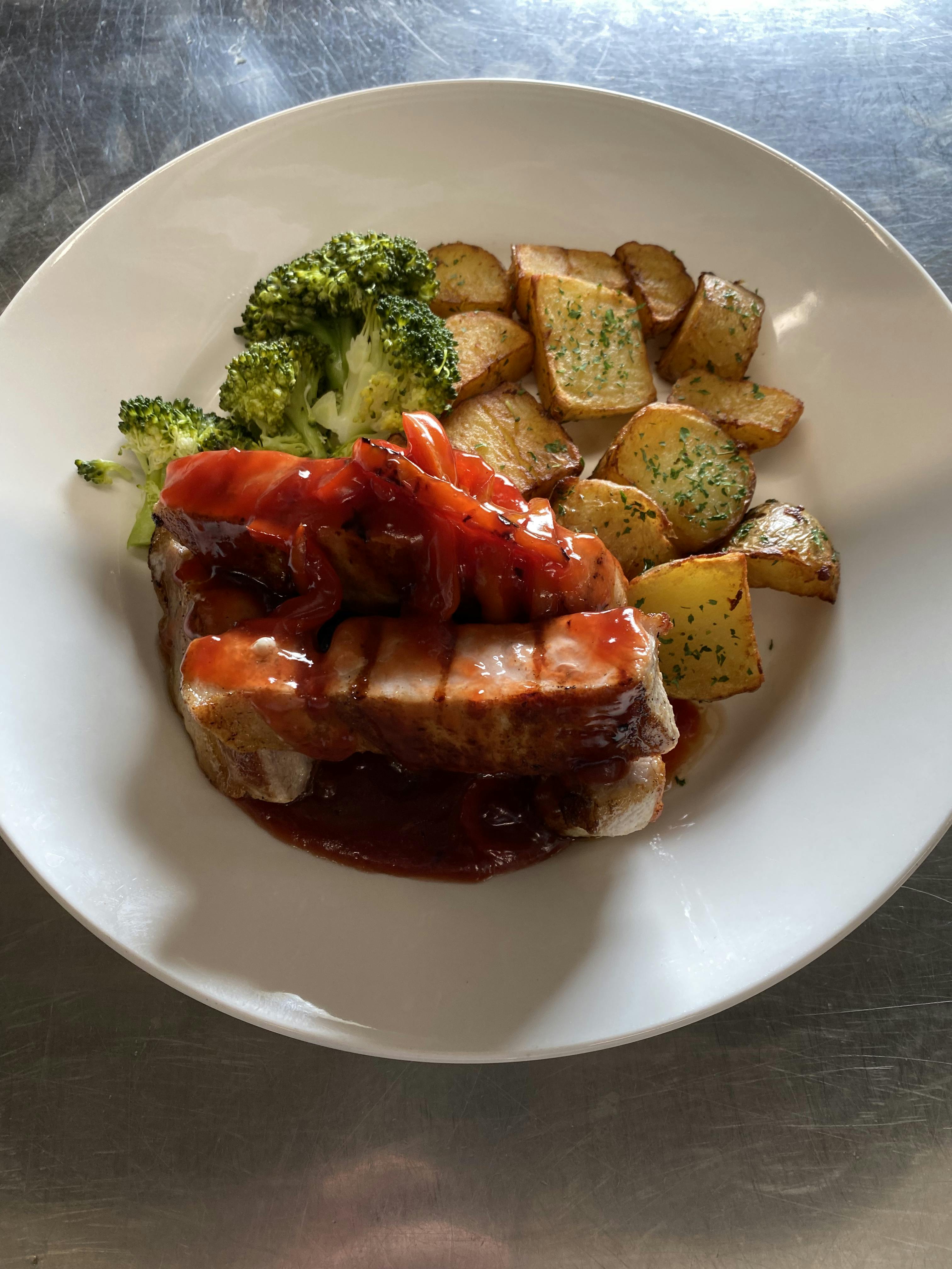 Grills Local Aged Steaks cut in house 5 - 6 oz Ribeye 10 - 12 oz Ribeye 8 oz Rump Served with battered onion rings, tomato, Portobello Mushroom, salad & gourmet chips. Sauces Peppercorn, Stilton, Diane. 12 oz Horseshoe Gammon Steak Served with pineapple, egg & chips. Hunters Chicken Butterfly Chicken breast, topped with BBQ sauce, cheddar, bacon & chips. Chicken Piri Piri Butterfly Chicken breast marinated in Piri Piri spices with savoury rice & chips. 14 oz BBQ Spare Ribs Rack of ribs, onion rings, corn on the cob & chips. Steak & Ribs Combo Ribeye steak & half rack of ribs & chips. Surf & Turf Combo Ribeye steak & wholetail Scottish Scampi & chips. 20 oz Mixed Grill Gammon steak, Ribeye steak, Chicken breast, sausages, egg, tomato, peas, onion rings, salad & chips.